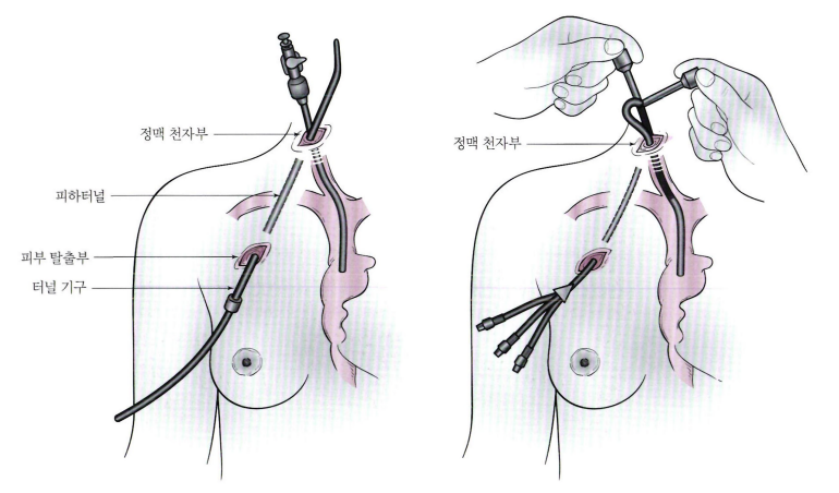 히크만 카테터는 다른 중심정맥관과 비슷하게 내경정맥을 통해서 삽입합니다.