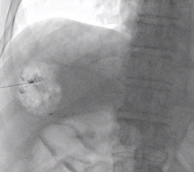 그래서 바늘의 뒷 부분 뚜껑을 열고 조영제를 조금 주입해서 바늘이 목표한 병변 안으로 들어갔는지 확인합니다.