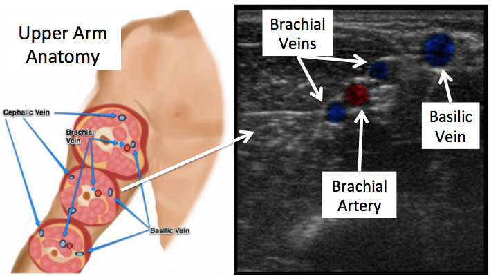 이상적인 경우 basilic vein 을 천자해서 정맥관 삽입을 하는데, basilic vein 이 작아서 천자하기 어려운 경우 brachial vein 을 천자하게 됩니다.