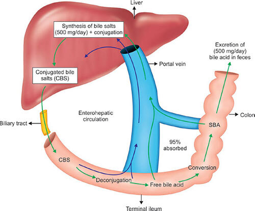 이 담즙은 일부는 간문맥을 통해 간으로 돌아와서 담즙 생성의 재료가 됩니다. (쉽게 말해 재활용이죠)