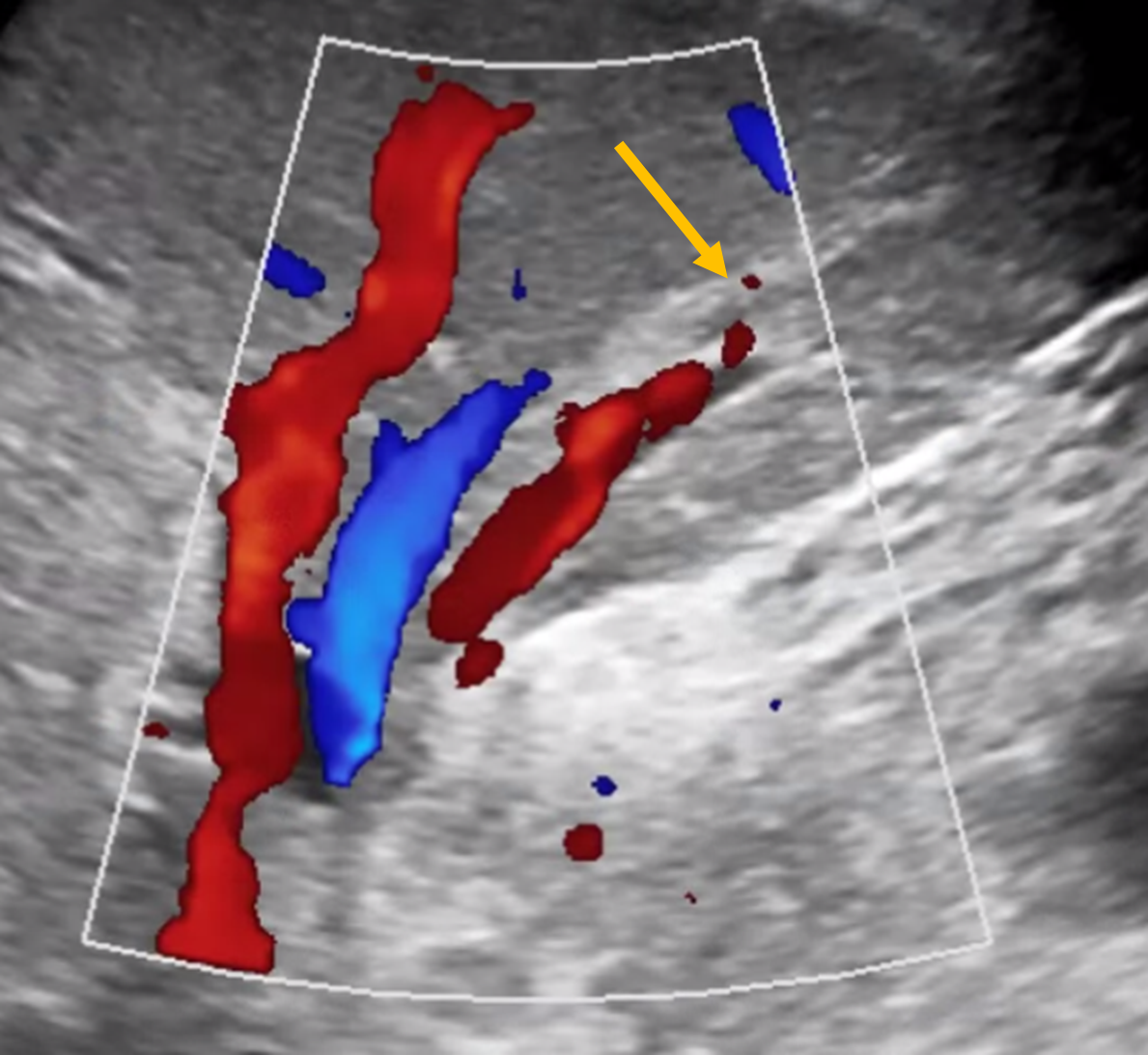 초음파로 늘어난 간내담관을 확인합니다.